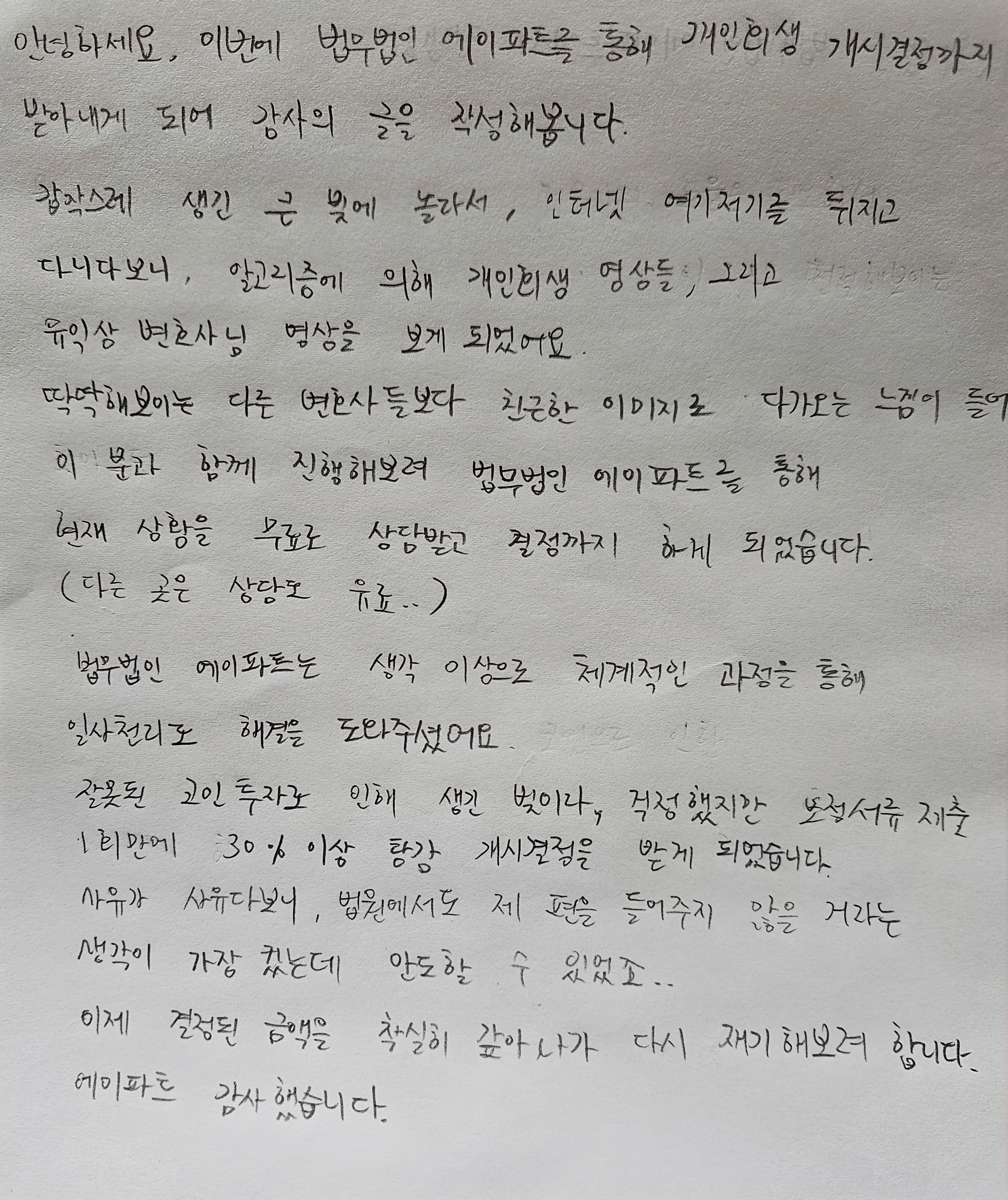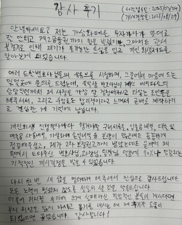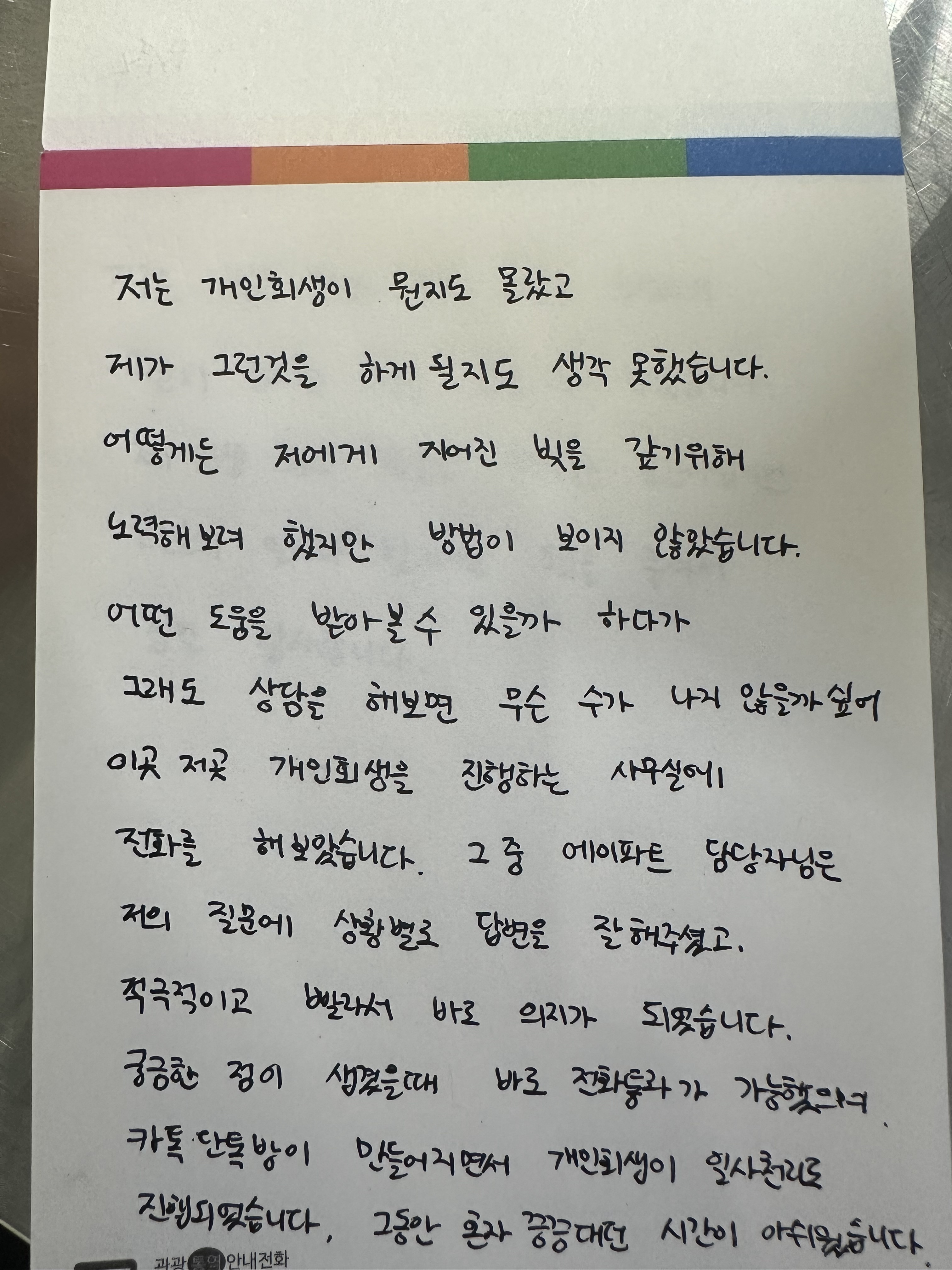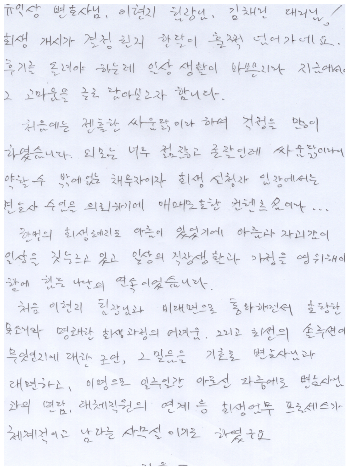덕분에 좋은 회생 조건으로 3년이란 시간을 견뎌낼 수 있었던 것 같습니다.2025-11-03 -
